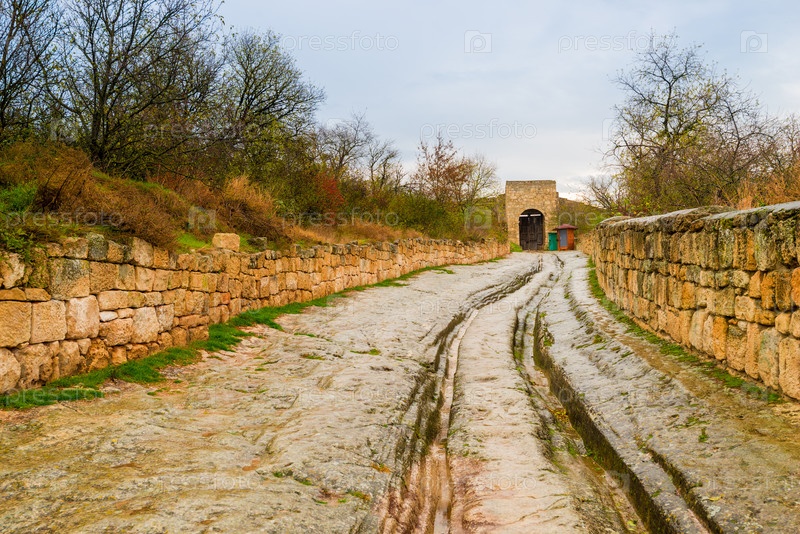 Каменная старая дорога с глубокой колеей в пещерном городе Чуфут-Кале в Крыму, Россия