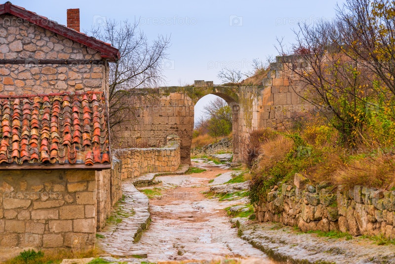 Пещерный город Чуфут-Кале в Крыму, вид на арку и дорогу