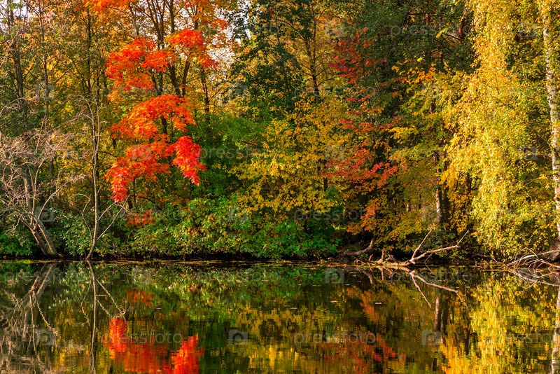 Спокойное красивое озеро с отражением в воде разноцветных деревьев, осенний пейзаж в парке