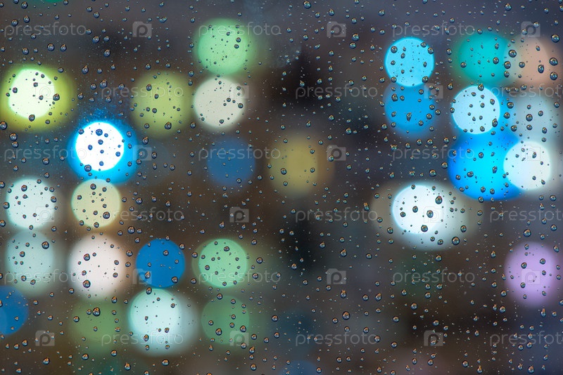 Стекло с каплями дождя макрос крупным планом, в фоновом освещении