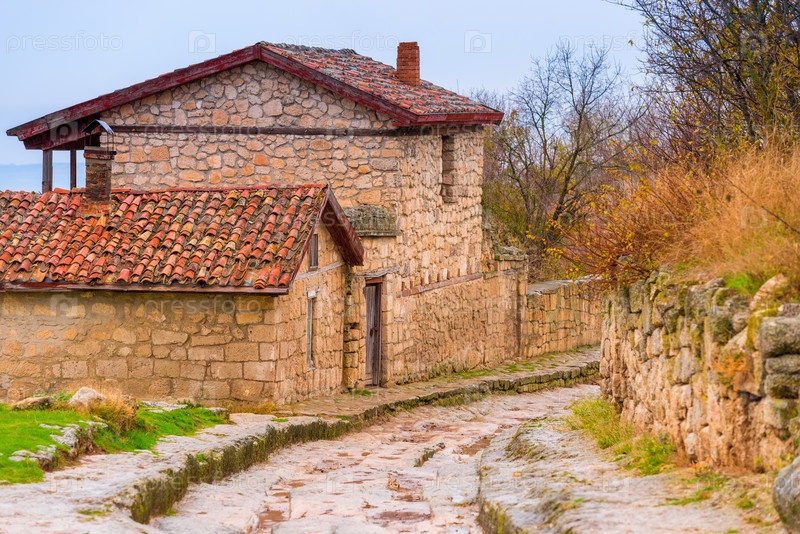 Каменные дома и дорога пещерного города Чуфут-Кале в Крыму