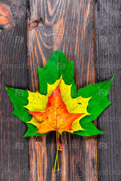 Кленовые листья в осенних цветах разных пирамид на деревянном фоне