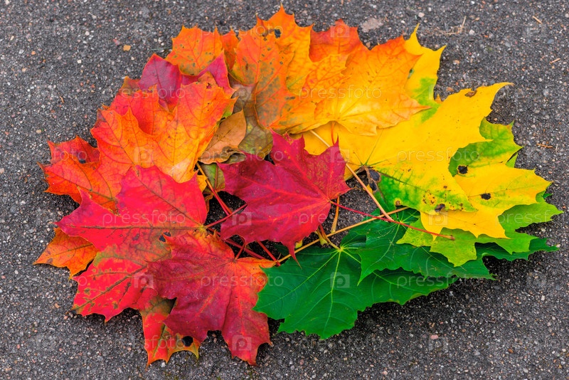 Красивые листья кленовой кучи на асфальте, осенняя природа