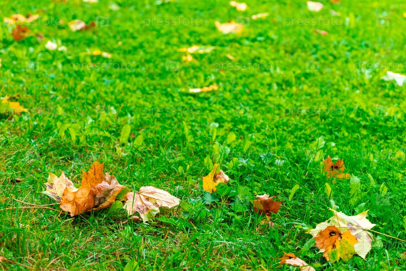 Осенний пейзаж - зеленый газон с летящими желтыми кленовыми листьями