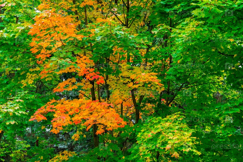 Клен в парке с красочными листьями, изменившими цвет, осенний пейзаж