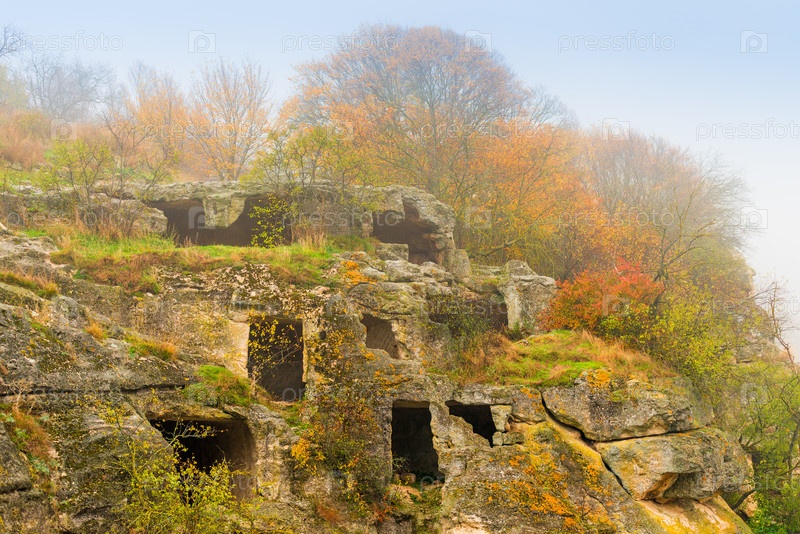 Комнаты пещерного города Чуфут-Кале, осенний туманный день, Крым, Россия