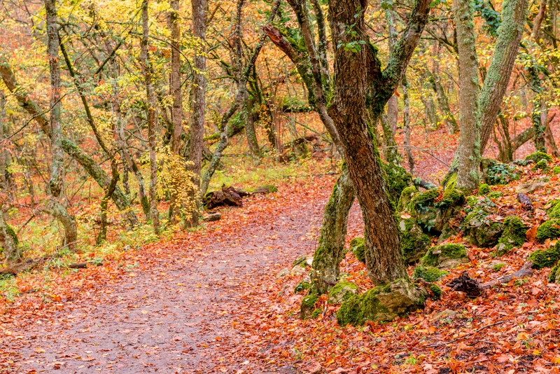 Дорога в парке, покрытая упавшими красными листьями
