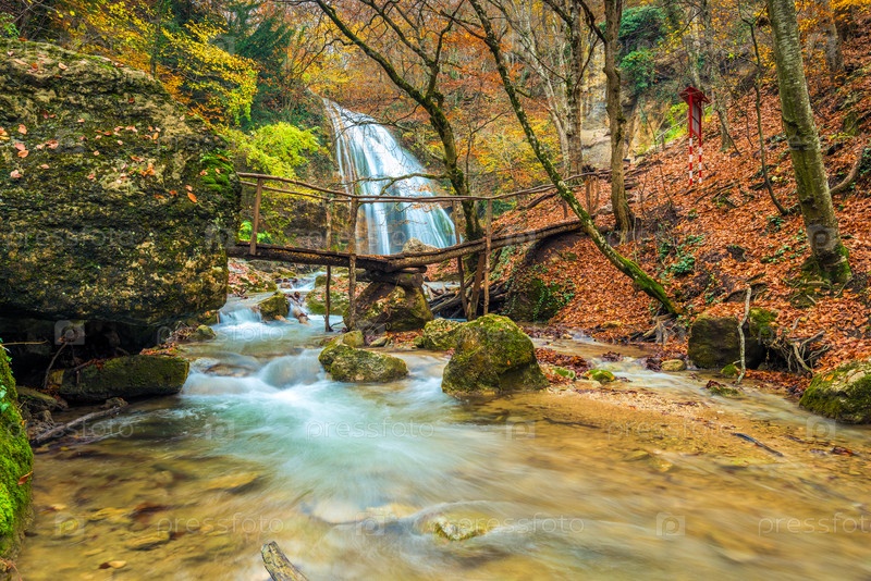 Большой полноводный водопад Юр-Юр, вид на открытку осенью, достопримечательность полуострова Крым, Россия