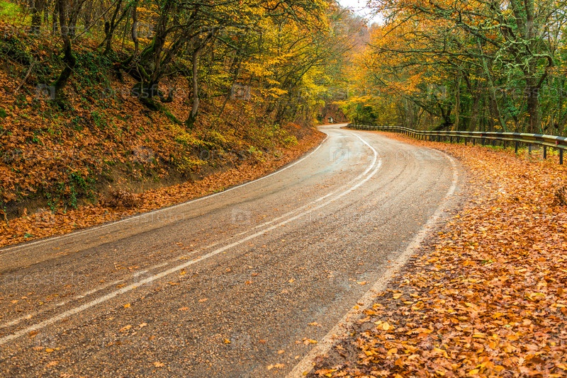 Автомобильное шоссе в горах, опасные повороты. осенний пейзаж