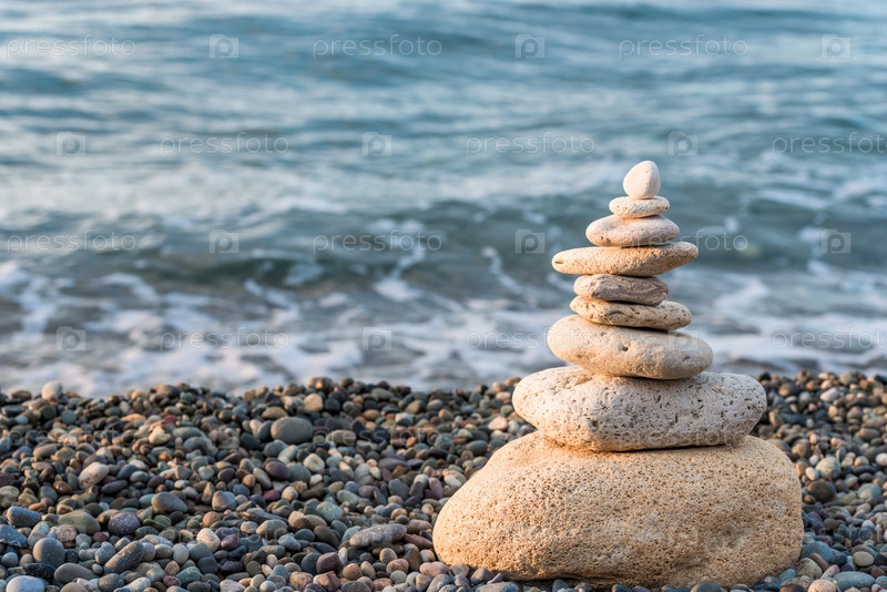 Пирамида из белых камней на галечном пляже крупным планом концепция фотобаланса