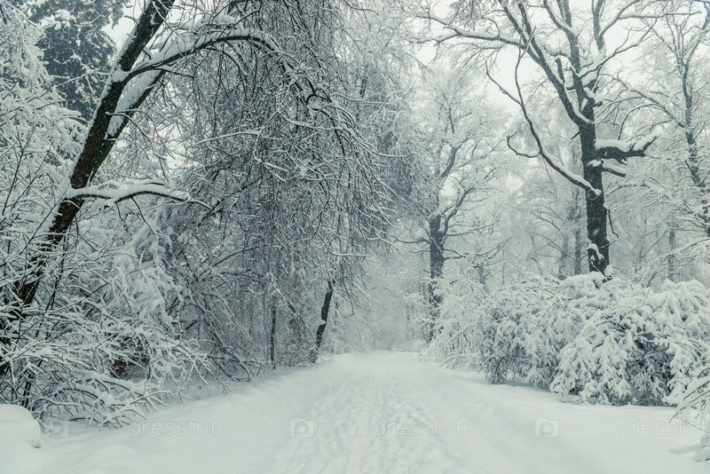 Зимний пейзаж - Деревья, покрытые сугробами в пустом зимнем парке
