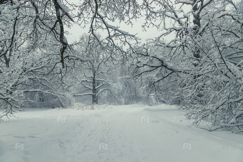 Деревья, покрытые снежными заносами в пустом зимнем парке