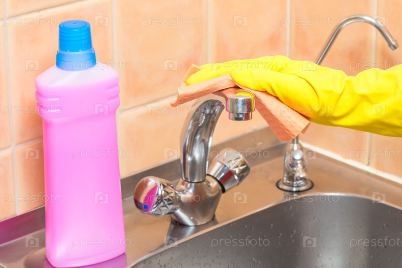 Женщина убирает кран на кухне тряпкой, руки в желтых перчатках крупным планом