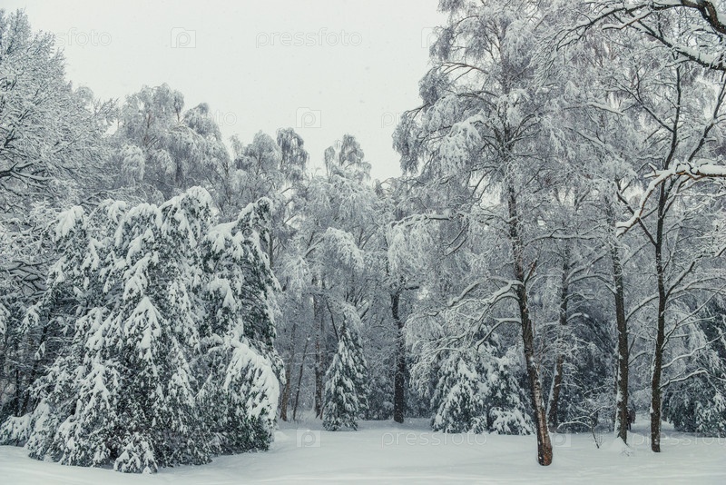 Восхитительный зимний лес после сильного снегопада, горизонтальный ландшафт