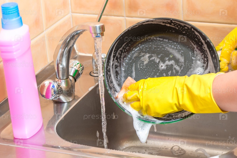 Женские руки в перчатках моют кастрюлю губкой с пеной на кухне
