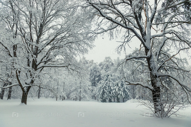 Красивый зимний лес после снегопада в пасмурную холодную погоду