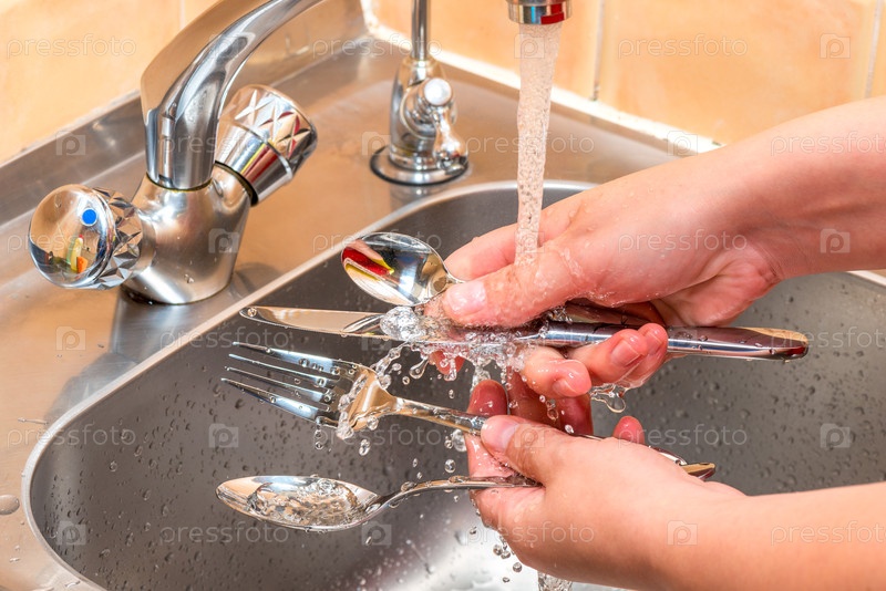 Женские руки моют столовые приборы под проточной водой на кухне, руки закрываются