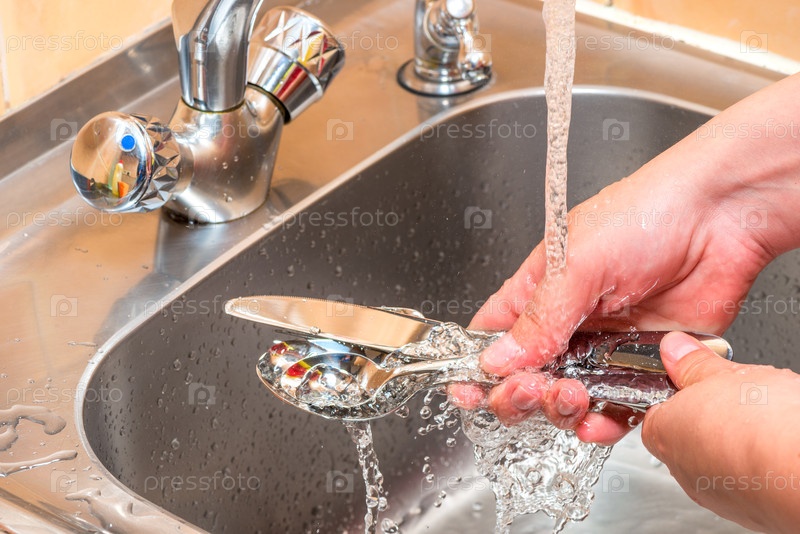 Руки вверх - мыть столовые приборы под проточной водой на кухне