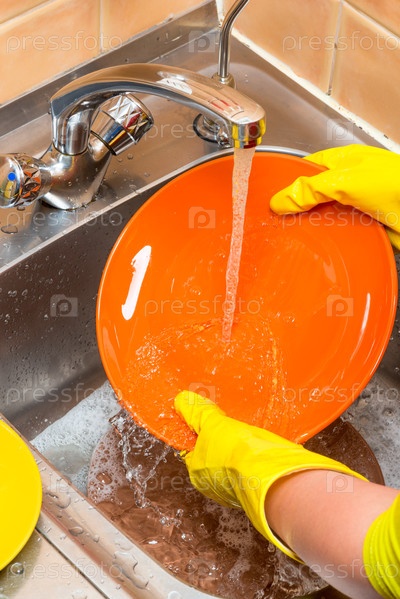 Женские руки моют тарелку в кухонной раковине под проточной водой