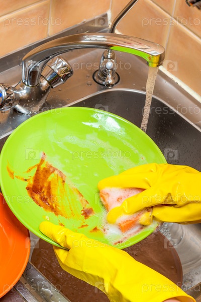 Женские руки в перчатках моют зеленую тарелку в раковине на кухне под проточной водой