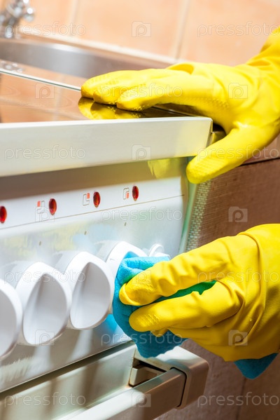 Уборка кухни - уборка плиты, руки тряпкой крупным планом