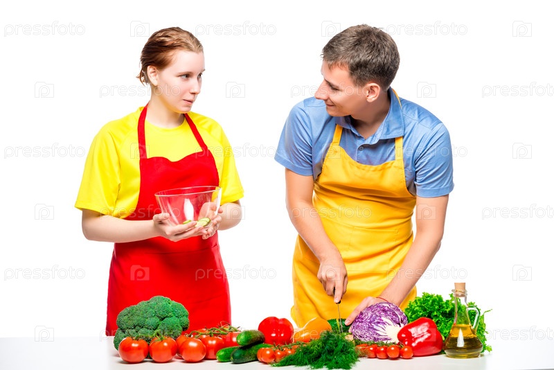 Семейная пара готовит здоровый овощной салат, снятый на белом фоне