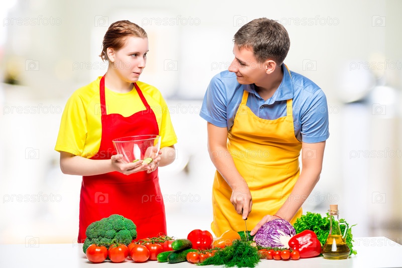 Молодая пара готовит на кухне здоровый овощной салат