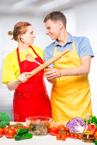Пара борется с кухонной утварью во время приготовления салата на кухне