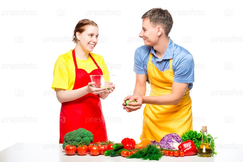 Мужчина и женщина готовят здоровый овощной салат изолированно на белом фоне
