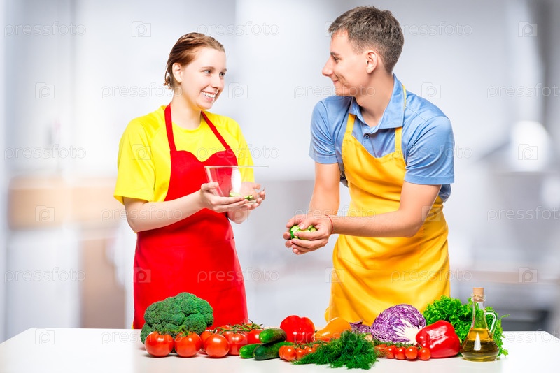 Мужчина и женщина готовят здоровый овощной салат на кухне