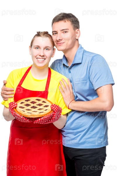Домохозяйка в фартуке с пирогом и ее любимый муж, портрет на белом фоне
