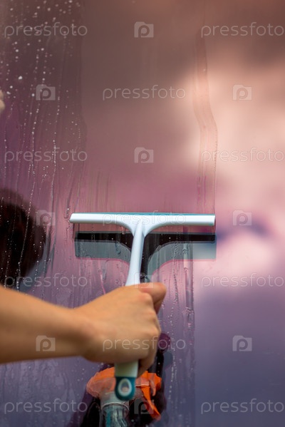 Мужская рука крупным планом - инструмент для чистки стекла