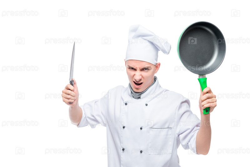 Сердитый безумный повар с ножом и сеткой на белом фоне