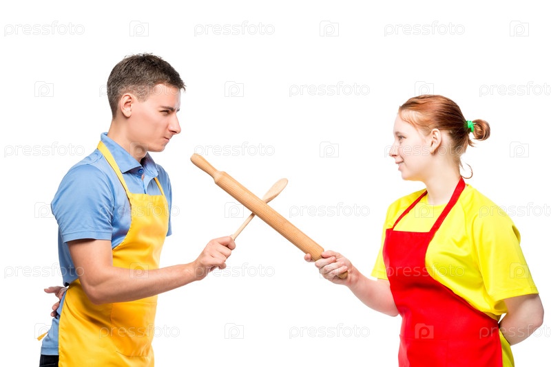 Мужчина и женщина в фартуке с кухонной посудой, сражающиеся на белом фоне