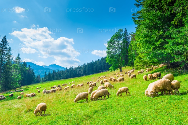 Пейзажный склон горы и стая овец на лугу в солнечный день
