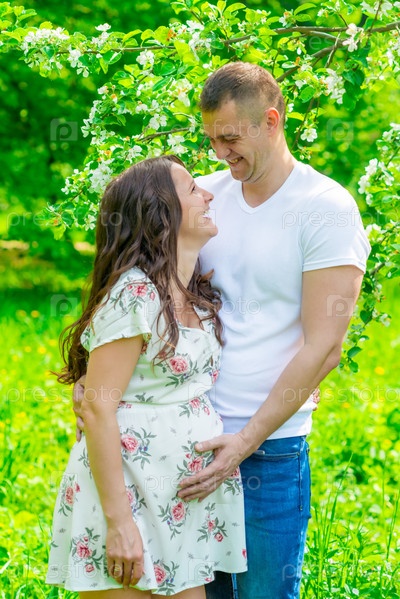 Молодая супружеская пара ждет детский портрет в парке