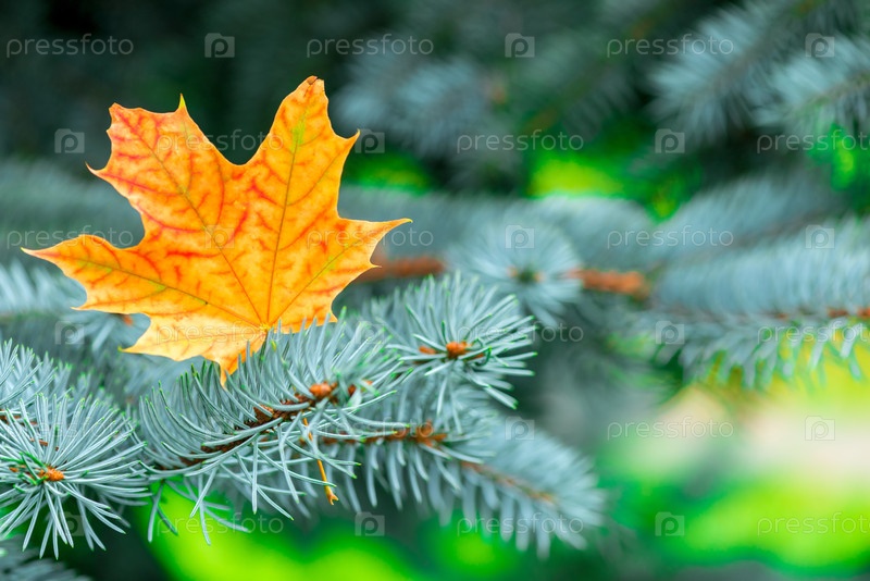 Яркий красивый желтый кленовый лист в синих еловых ветвях крупным планом