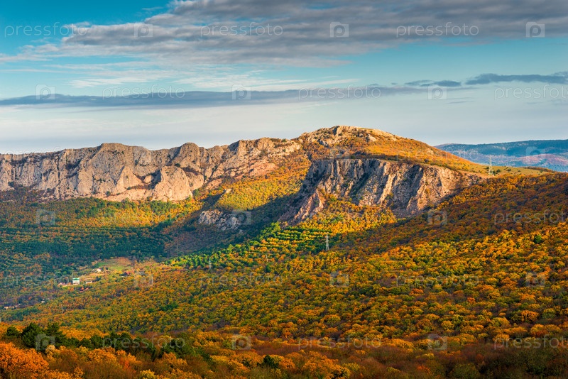 Красивый осенний живописный пейзаж - оранжевый лес и скалистые горы на солнце