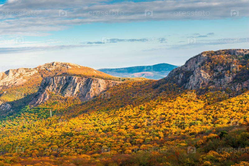 Склон горы покрыт осенним лесом, живописный ландшафт Крыма, Россия