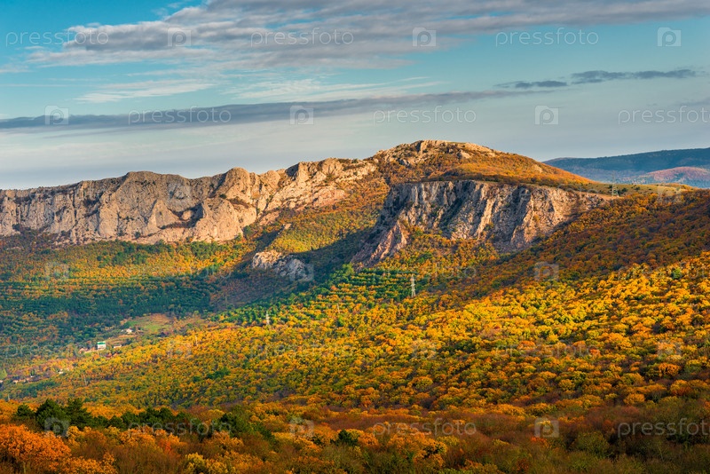Красивые скалистые горы и вид на осенний лес у подножия, красивые пейзажи
