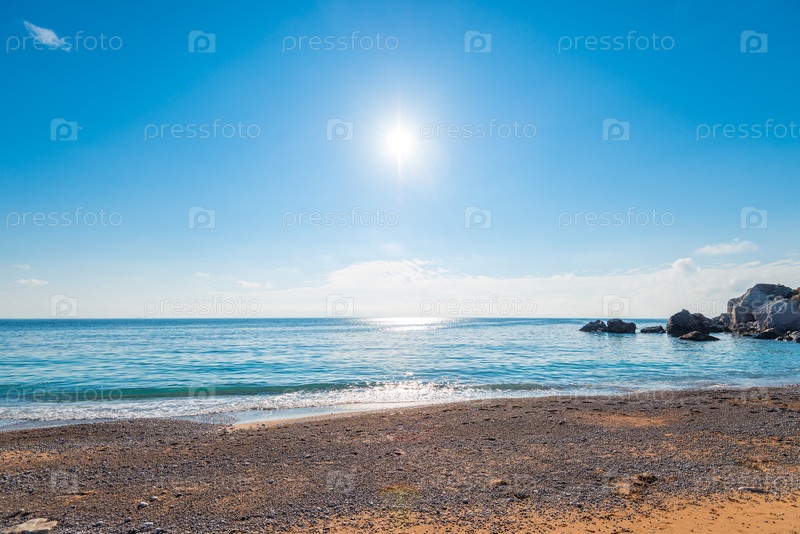 Яркое полуденное солнце над чистой морской водой, вид на горизонт. Морской пейзаж