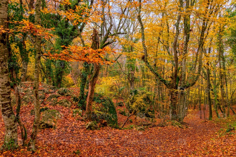 Осенний горный парк, путь, ведущий вниз к склону