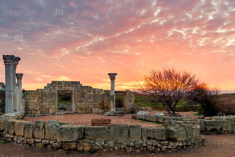 Красивая достопримечательность Крыма - Древний Херсонес, руины на закате