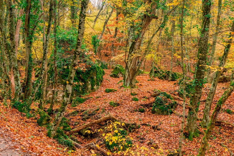 Осень, лес в горах, опавшие листья на железной дороге и большие валуны - живописный осенний пейзаж