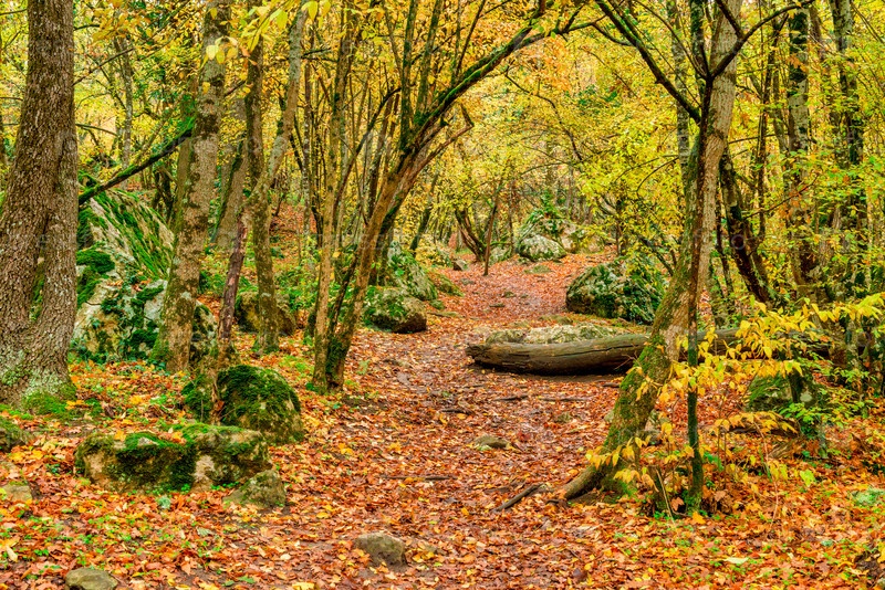 Путь в осенний лес, покрытый опавшими яркими листьями