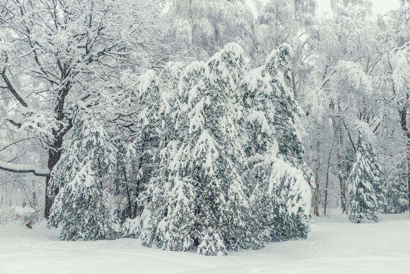 Красивый зимний лес после сильного снегопада, горизонтальный ландшафт