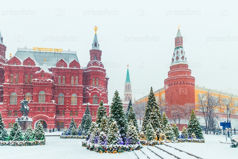 Новый год, вид на Кремль и Исторический музей на Красной площади, Россия, Москва