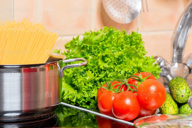 Свежие овощи и горшок спагетти на кухне возле раковины