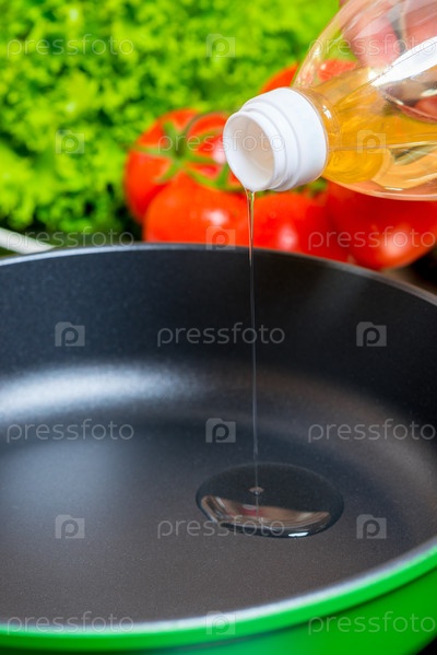 Крупным планом горячую кастрюлю, которую заливают подсолнечным маслом для приготовления пищи