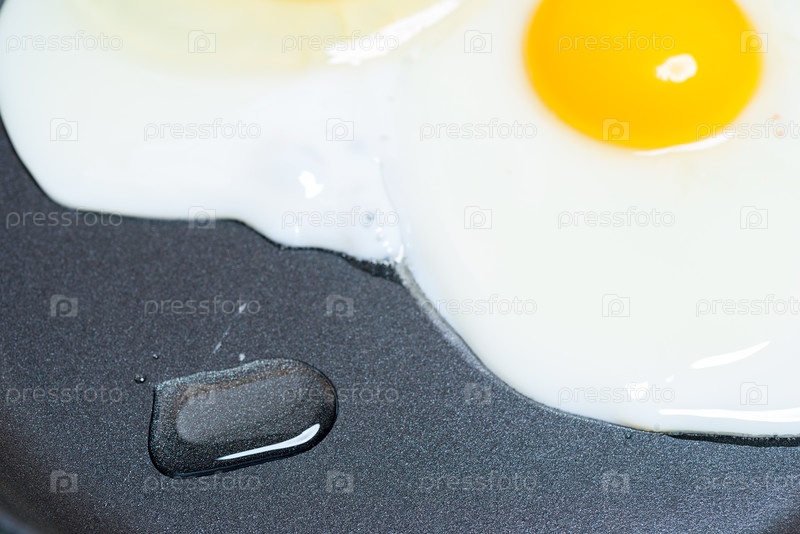 Капля масла в сковороде и жареные яйца крупным планом